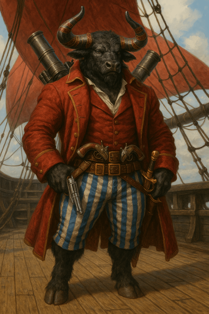 Towering at over eight feet in height, this massive minotaur is a mountain of muscle wrapped in jet-black fur, his bulk rivaling even the most hardened war golems. His sweeping, forward-arched horns are polished to an obsidian sheen, etched with ceremonial bands of silver and deep crimson—each marking a rite of passage, a campaign survived, or a debt earned and paid in full. At a glance, he appears a creature born for destruction—a force of pure intimidation clad in weathered naval garb cut and tailored to fit his massive frame. Yet, despite his fearsome presence, there is a glimmer of something else in his eyes—something older, wiser, and strangely warm.