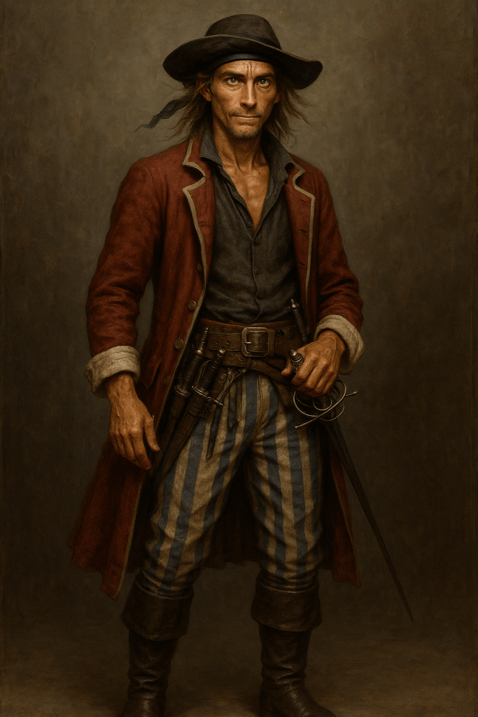 His eyes, a pale and piercing gray-green, seem to catch every flicker of movement, every whisper of deceit. They flash with the sharpness of a dagger’s edge and the cold patience of someone who has spent too much time watching people lie to themselves and others. It is said he once picked out a mutineer from a glance, a thief by the twitch of a finger, and a killer by the way they blinked. If Talbot fixes you with a smile, you may feel warmed by it—but deep down, you’ll know it’s a calculated thing. Measured. Weighted.