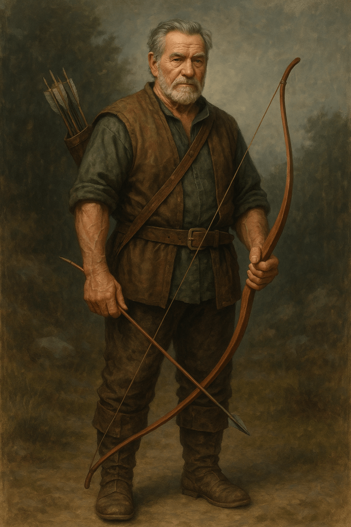 Behind the counter, half-hidden by a sliding wall of laminated wood strips and half-finished stave blanks, works Jorvan Rethell, a grizzled veteran of Mithrin’s border legions. Broad-shouldered even in age, Jorvan moves with a craftsman’s economy—his once-hardened limbs now more accustomed to drawing string than steel. He bears the quiet gravitas of a man who saw too many arrows loosed in anger, and now prefers those that fly for sport, sustenance, or ceremony.