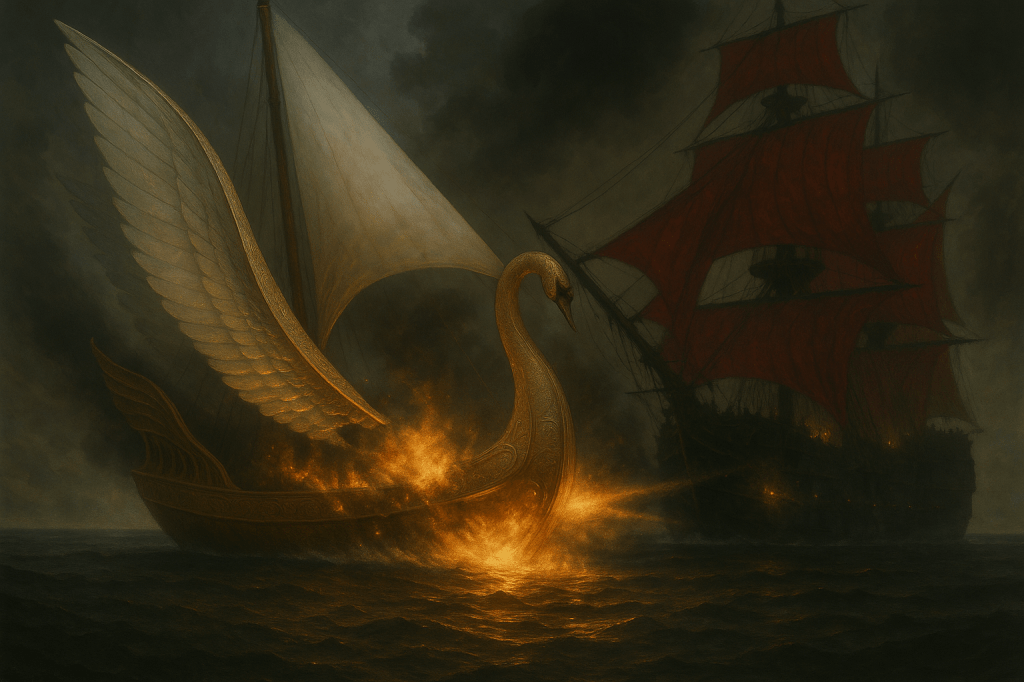 And when the last of the swan’s gilded hull slipped beneath the waves, the smoke curling like incense into the dark sky—I turned to him.