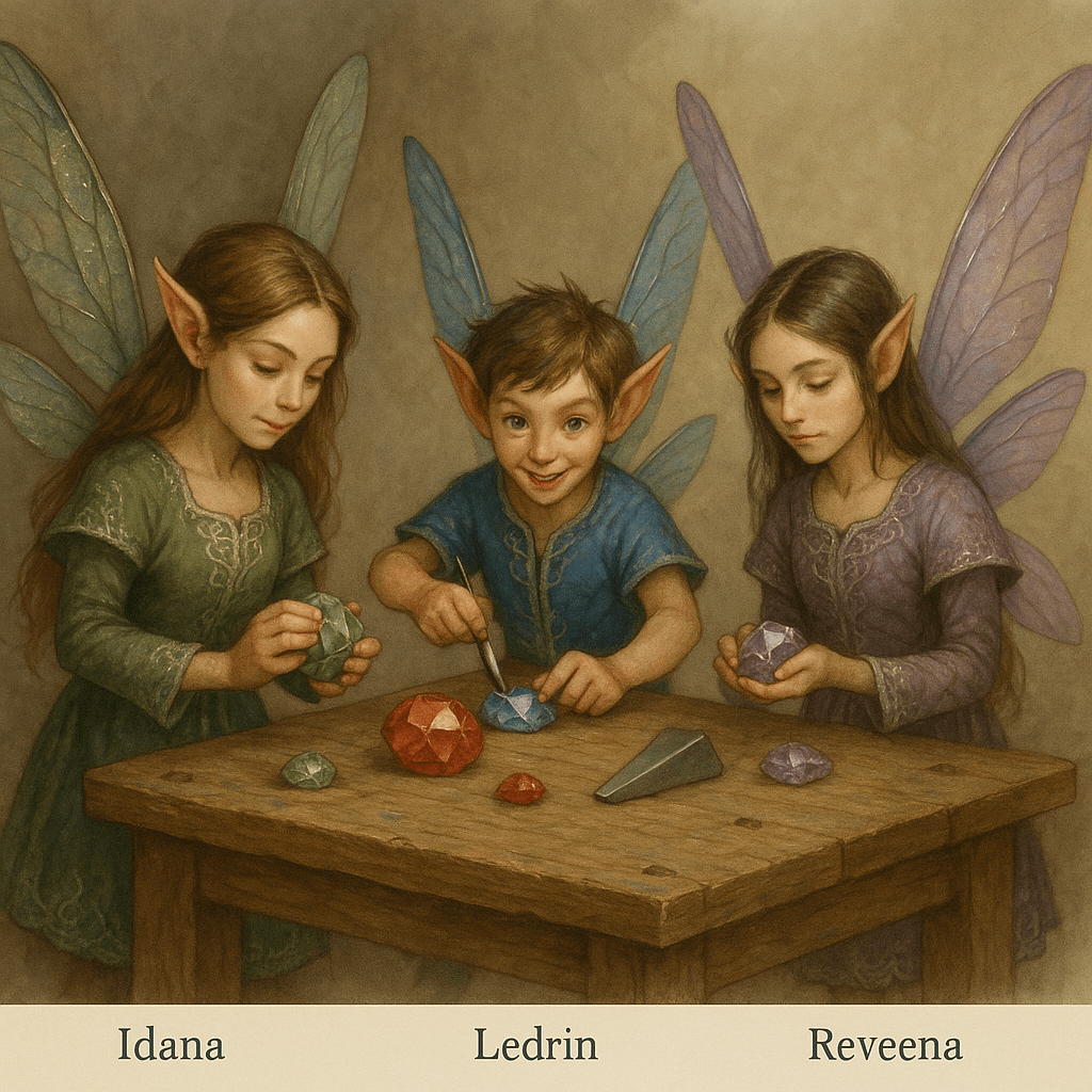 Idana, Ledrin and Reveena The Sprites – Gem-Cutting Companions